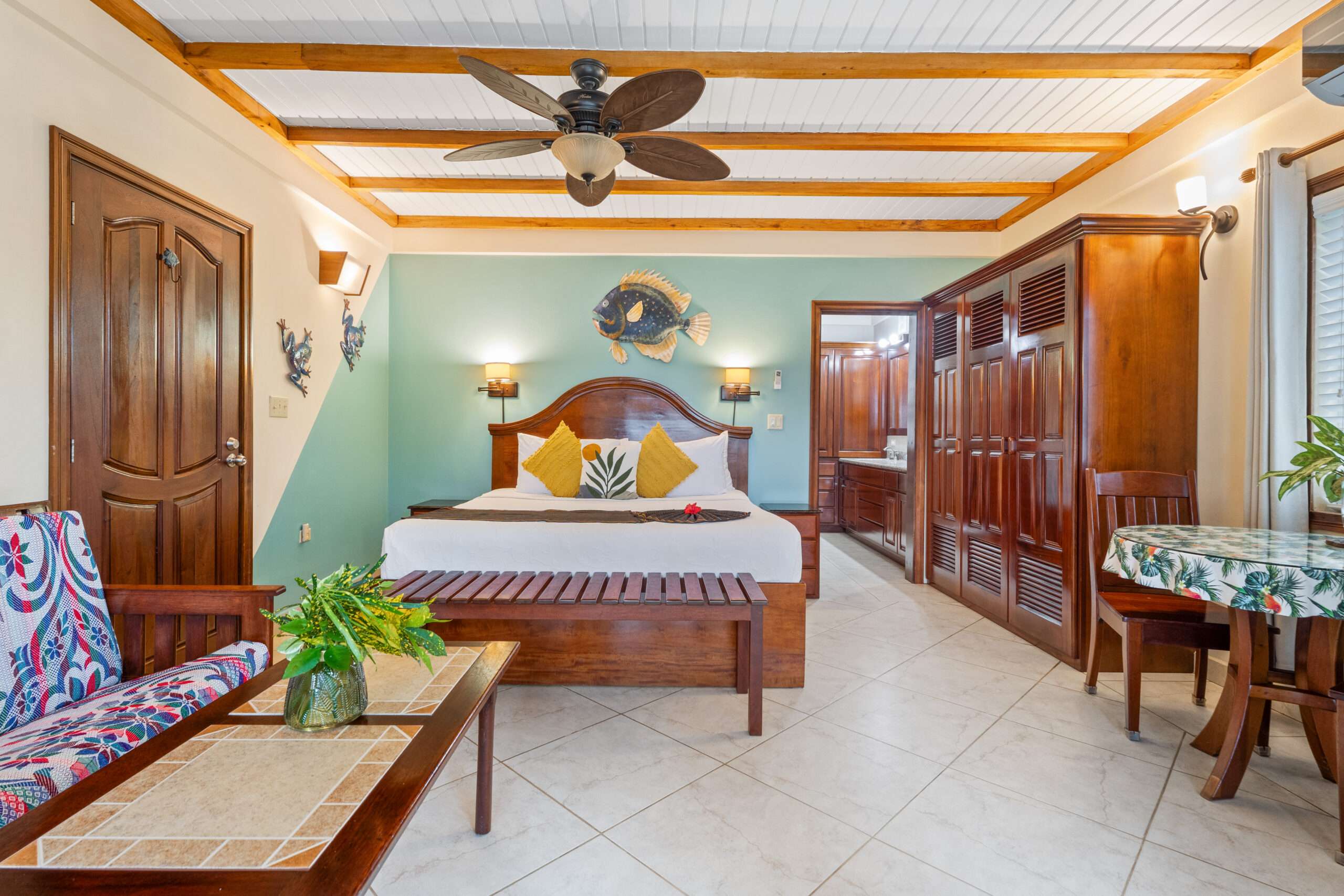 Second-floor suite with an orthopedic king bed and futon, glass doors opening to a veranda overlooking the sea, and the option to expand into an adjoining kitchen and living area (“suite option”).