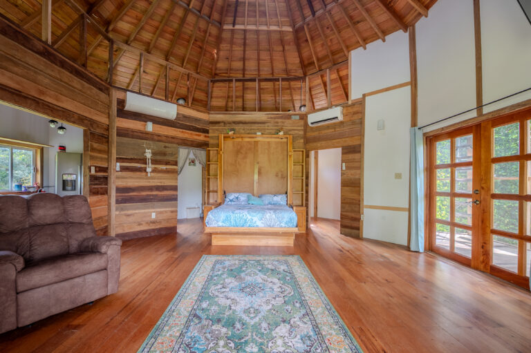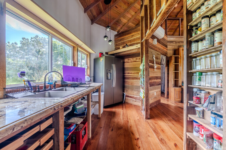 The home features an open-concept living and dining area filled with natural light, creating a bright and inviting space ideal for everyday living or entertaining. The kitchen is thoughtfully designed with clean lines, and functional workspace. The couch in the living room converts to a queen size bed making it easy to open up the space during the daytime.